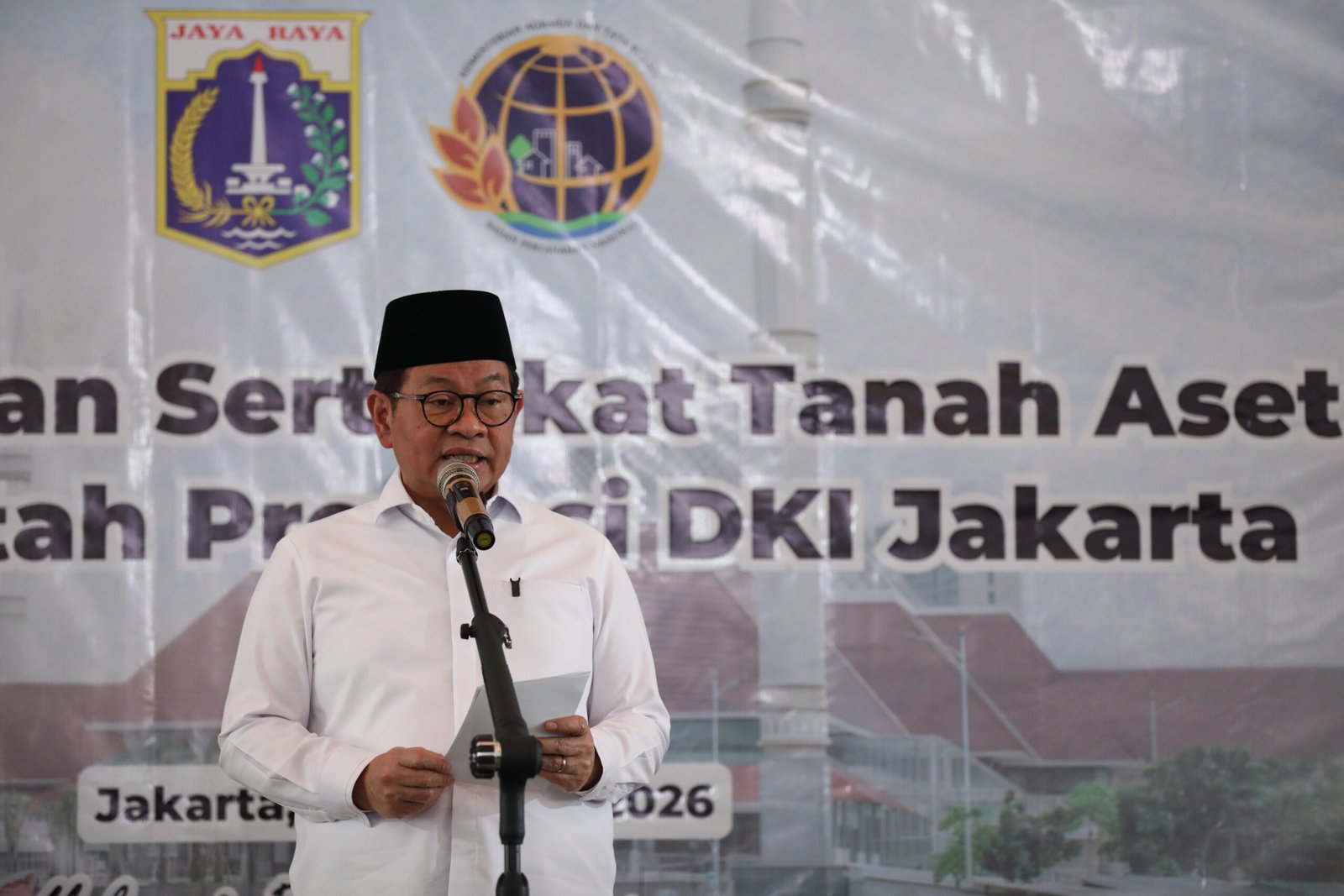 Gubernur DKI Jakarta, Pramono Anung, menerima 3.922 Sertifikat Hak Pakai atas tanah aset milik daerah dari Kementerian Agraria dan Tata Ruang/Badan Pertanahan Nasional (ATR/BPN) di Masjid Raya KH Hasyim Asy’ari, Jakarta Barat, pada Jumat (13/2). Gube...