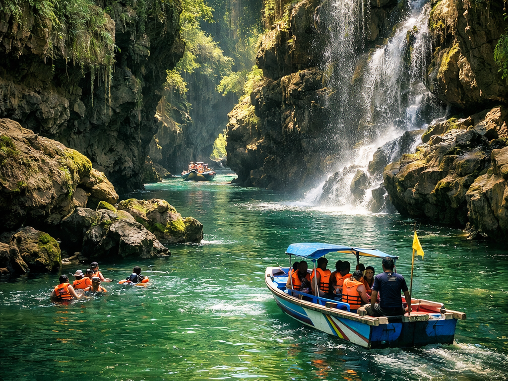 Pengalaman wisata: Wisatawan akan diajak menyusuri sungai menggunakan perahu kayu, kemudian dapat berenang atau body rafting. Tebing tinggi dan suasana alami memberikan sensasi petualangan yang menyegarkan.